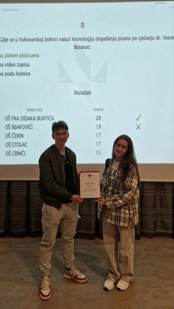 Zahvaljujući Ministarstvu hrvatskih branitelja Republike Hrvatske i ove godine učenici 9-og razreda naše škole posjetili su Vukovar. Upoznali su grad pun povijesti i uspomena Domovinskog rata. Blagoslovom našeg župnika fra Velimira, krenuli smo na terensku nastavu prema Vukovaru. Posjetili smo Spomen dom Hrvatskih branitelja na Trpinjskoj cesti, izložbene postave u krugu Memorijalnog centra, Vukovarsku bolnicu 1991., Memorijalno groblje žrtava Domovinskog rata, Spomen dom Ovčara i masovnu grobnicu na Ovčari, hangar Veleprometa, spomen obilježje Kukuruzni put- Put spasa, ruševine Borovo Commercea te crkvu sv. Filipa i Jakova. Osim memorijalnih lokacija, obišli smo Gradski muzej Vukovar i Muzej vučedolske kulture.Pored terenske nastave, imali smo i zabavan program disko i slobodno vrijeme za druženje. Ova terenska nastava nije bila samo putovanje kroz grad, već i kroz sjećanja, povijest i prijateljstvo. Zajedno smo se smijali, učili i dijelili trenutke koji su nas povezali na poseban način. Svaki pogled, svaka šetnja i svaki smijeh ostat će u našim srcima kao dragocjena uspomena koja nas podsjeća da su prijateljstvo, zajedništvo i radost ono što život čini nezaboravnim.